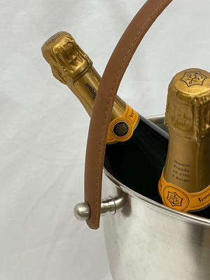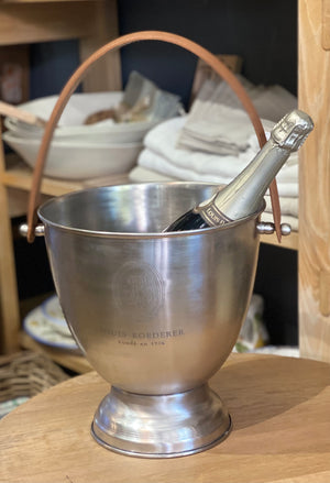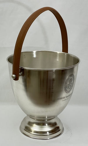 Louis Roedere Pewter wine or champagne cooler with beautiful Tan leather handle for easy carrying.